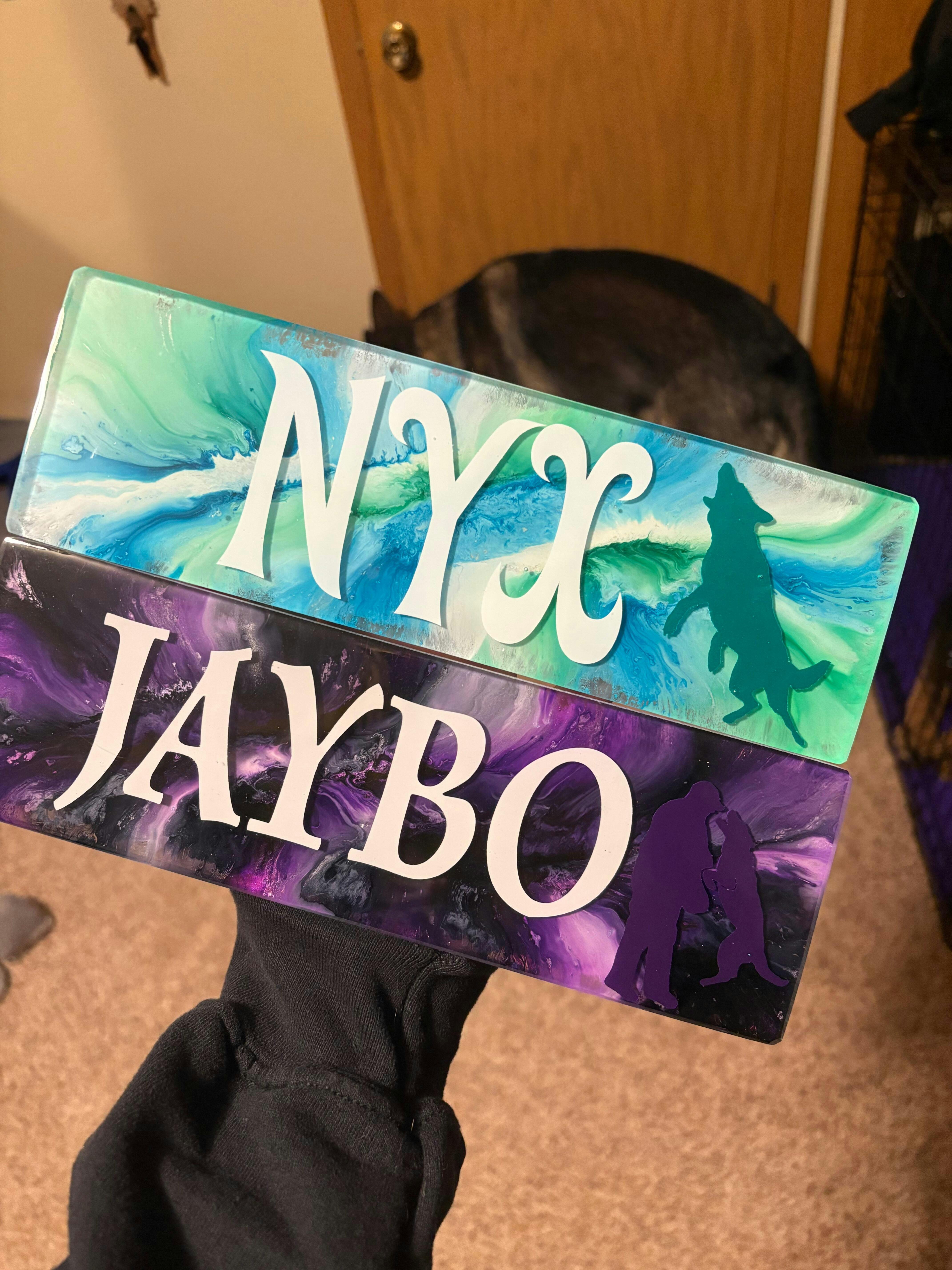 Choose ink colors, glitter, font & vinyl colors. These tags are made with ink like what it pictured above, NOT like the new technique/materials I have recently been posting about. I am unfortunately not doing the new technique as customs at this time.*