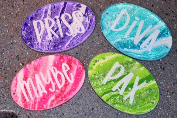 Choose ink colors, glitter, font & vinyl colors. These tags are made with ink like what it pictured above, NOT like the new technique/materials I have recently been posting about. I am unfortunately not doing the new technique as customs at this time.*