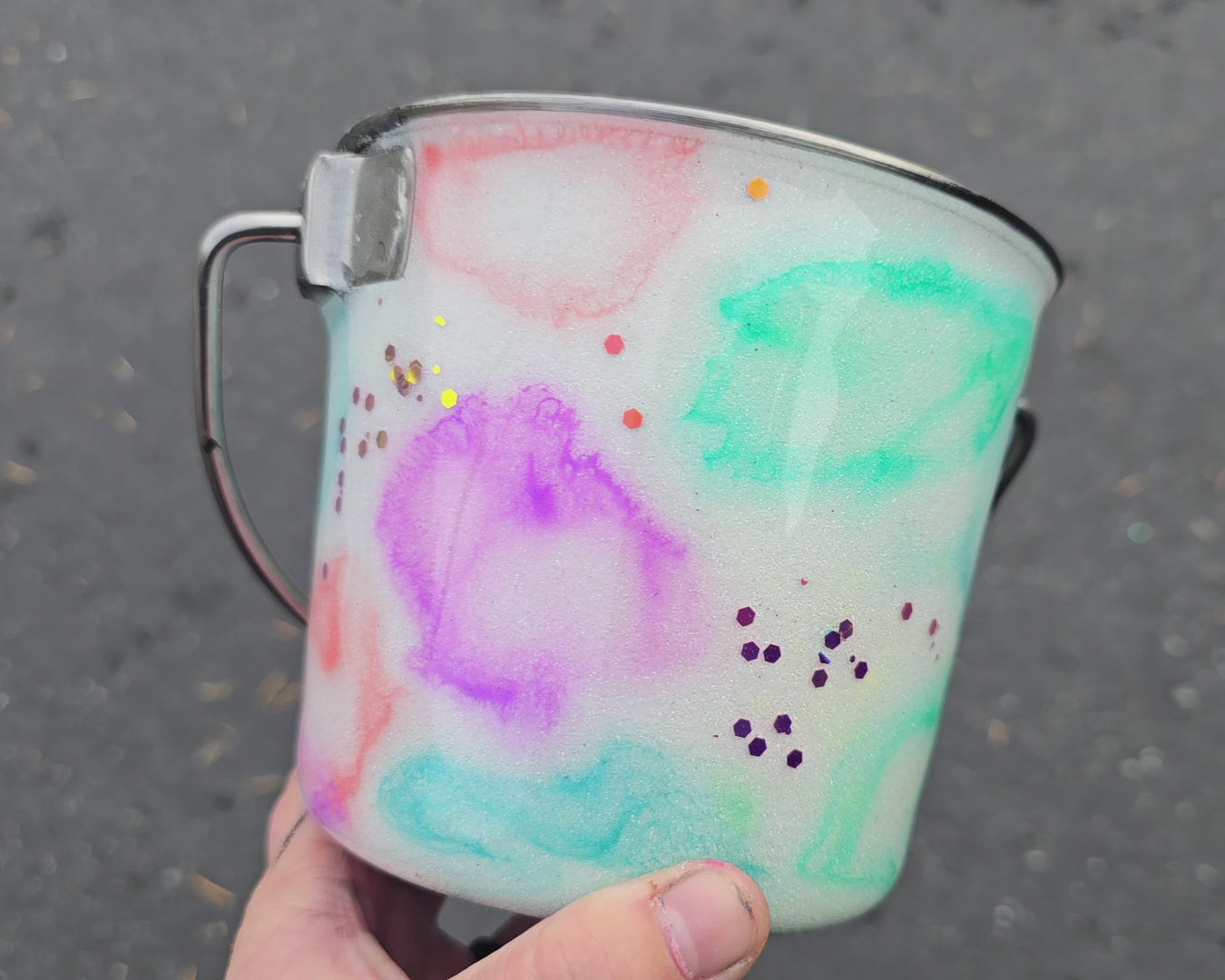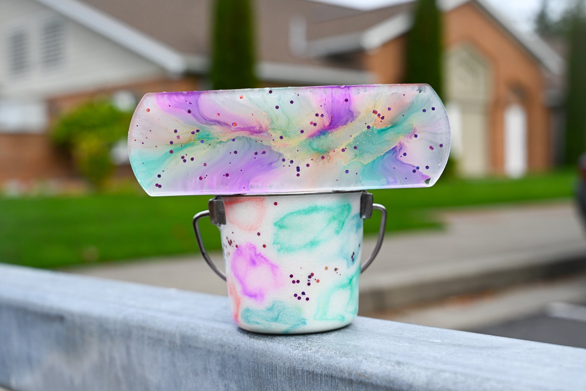 If you choose to have text added to your bucket, it will NOT be sealed in by a layer of resin. I unfortunately do not have the equipment to do so. If you'd like it to be sealed in, once you receive your bucket, you can reach out to the bucket maker (On Point Designs) and work something out with her!